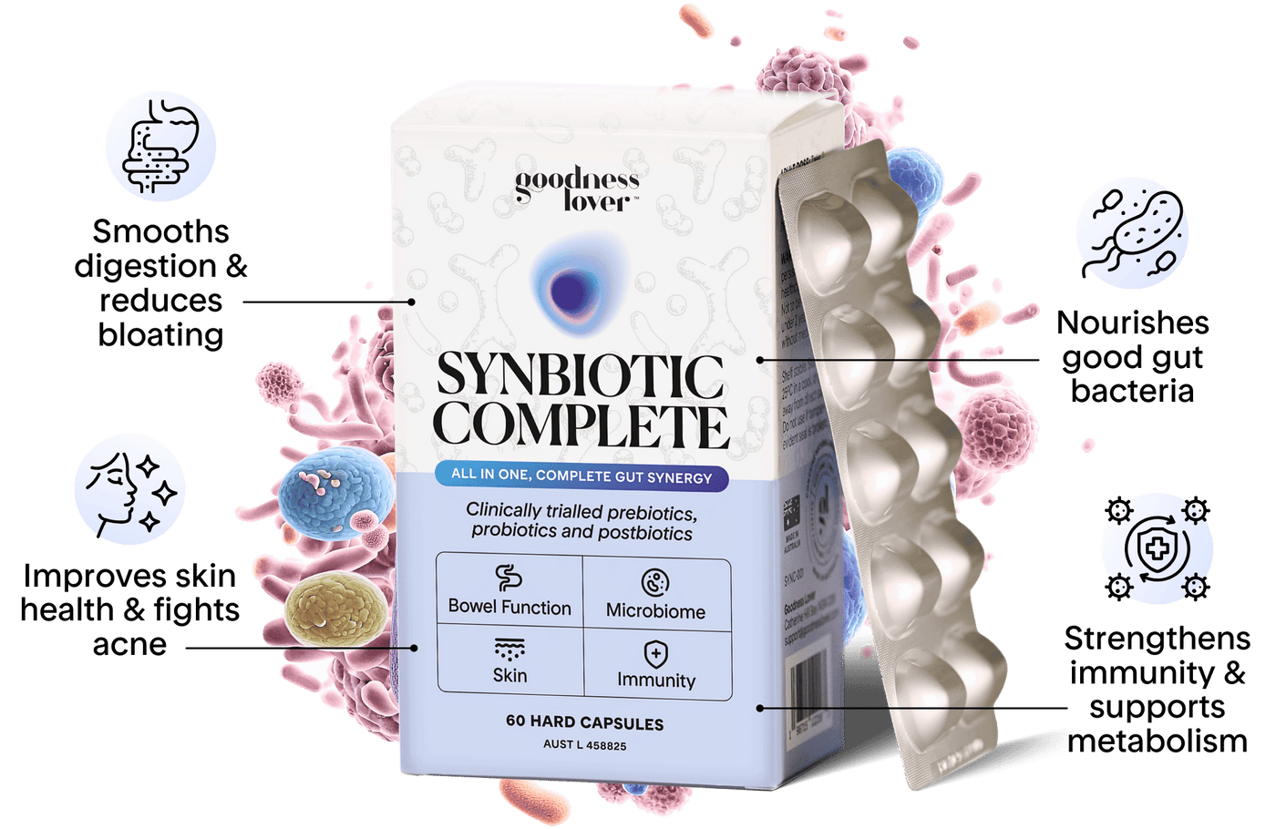 "Synbiotic Complete is packed with scientifically-backed bacterial strains that effectively navigate the gut, alleviate digestive discomfort, and restore a harmonious flora.