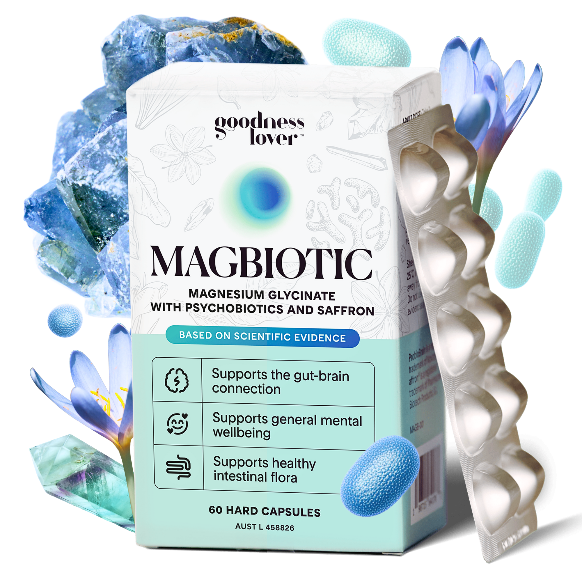 A: Magbiotic contains ProbioBrain®, a clinically studied “psychobiotic” probiotic strain that enhances gut-brain communication, supports serotonin production, and promotes a balanced mood. Combined with Magnesium Glycinate and Affron® Saffron, it helps regulate stress, digestion, and emotional well-being.